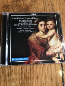 Zuletzt möchte ich noch auf ein paar Werke Carl Philipp Emanuel Bachs eingehen. Erst 2023 erschien eine reizvolle Aufnahme mit dem Magnificat das Bach Sohnes sowie einer Weihnachtskantate wie einem Chor zu einer Hamburger Festivität bei CPO mit der Kölner Akademie unter Michael Alexander Willens mit ausgesuchten Solisten. Zumindest das Magnificat des Bach-Sohnes wurde schon öfters eingespielt.