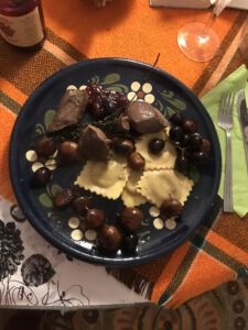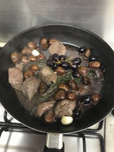 Wir bereiteten Hirschgulasch aus heimischem Forst an Maronen mit Thymian, Knoblauch und Steinpilz-Tortelloni, löschten mit einem Schuss des Weins alles ab.