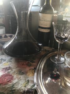 Diesmal benutzte ich einen großen Glasdekanter. Nach dem Entkorken entfaltet der granatrote Wein ein elegantes Bukett aus feinen Duftnoten und Aromen von Waldbeeren, Kirsche, Brombeeren ein wenig Heidelbeere, Süßholz und Unterholz wie Tabak und erdigen harmonischen Noten mit etwas Leder.