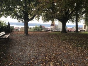 Vom Verkehr und anderen Geräuschen bekommt man an diesem idyllischen grünen Platz kaum etwas mit. Schützend umfrieden den kleinen Garten die Gebäude des stattlichen Patrizierhauses. Also lasse man seine Seele baumeln und die Gedanken schweifen beim Blick auf Dächer, Giebel und See wie Wälder und ferne Alpen und womöglich wird einem ganz poetisch zu Mute. Erst kürzlich an einem herbstlichen Tag schlüpften mir folgende Verse in die poetischen Adern und ich notierte mit meiner goldenen Caran d‘Ache Feder ein von barocker Vanitas Lyrik inspiriertes Herbst-und Vergänglichkeitsgedicht.