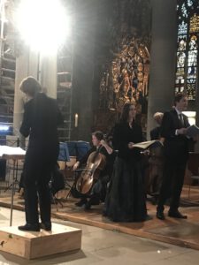 Natürlich entfaltete die Aufführung in der spätgotischen Kirche des St. Nikolaus Münsters gerade vor der Folie des großartigen frühbarocken Retabels der Brüder Zürn, das Überlingen über seine süddeutsche, etwas biedere Provinzialität erhebt und zur großen Kunstgeschichte zählen lässt, ihren eigenen besonderen Reiz.