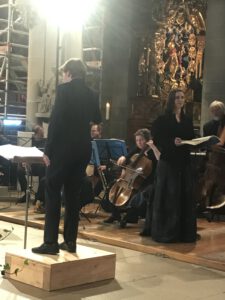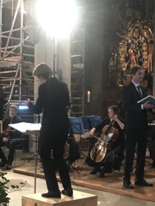 Das Orchester spielte mit helltönendem Feinschliff auf historischen Streichern, gemischt mit colla parte geführten Barock-Oboen und in den großen Chören hinzu tretenden Barock-Trompeten und Pauken. Schlank grazil und dennoch mit Fülle, wo es verlangt wird.