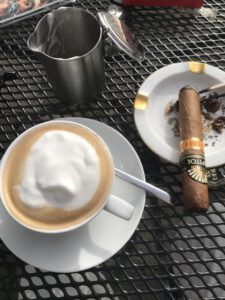 Nach dem Anschneiden mit dem Cutter und Anzünden mit einem langen Streichholz gefällt der feine Gusto nach Café-Röstnoten und Mandel bis Nuss-Aromen. Ein wenig Touch nach Leder und Holznoten wie Heuaromen rundet das gleichmäßige Geschmacksbild ab. Dazu passt etwa ein cremiger Café mit locker aufgeschäumter Milch im Kännchen.